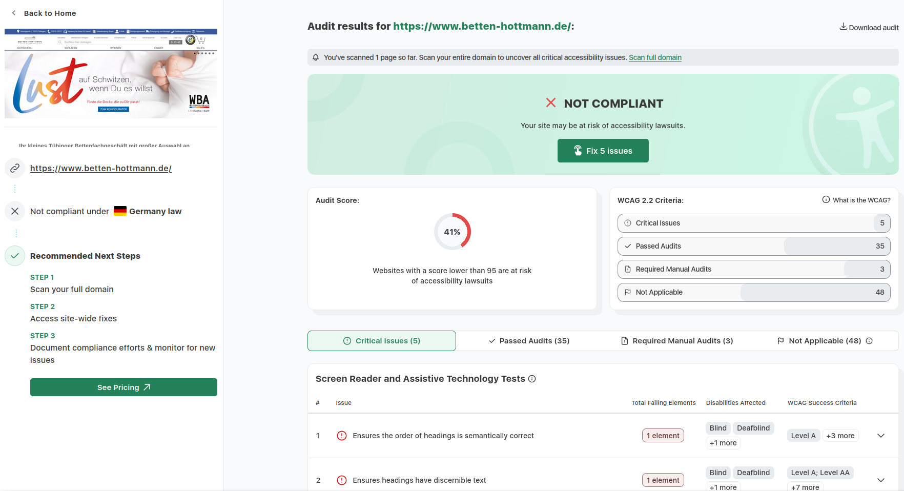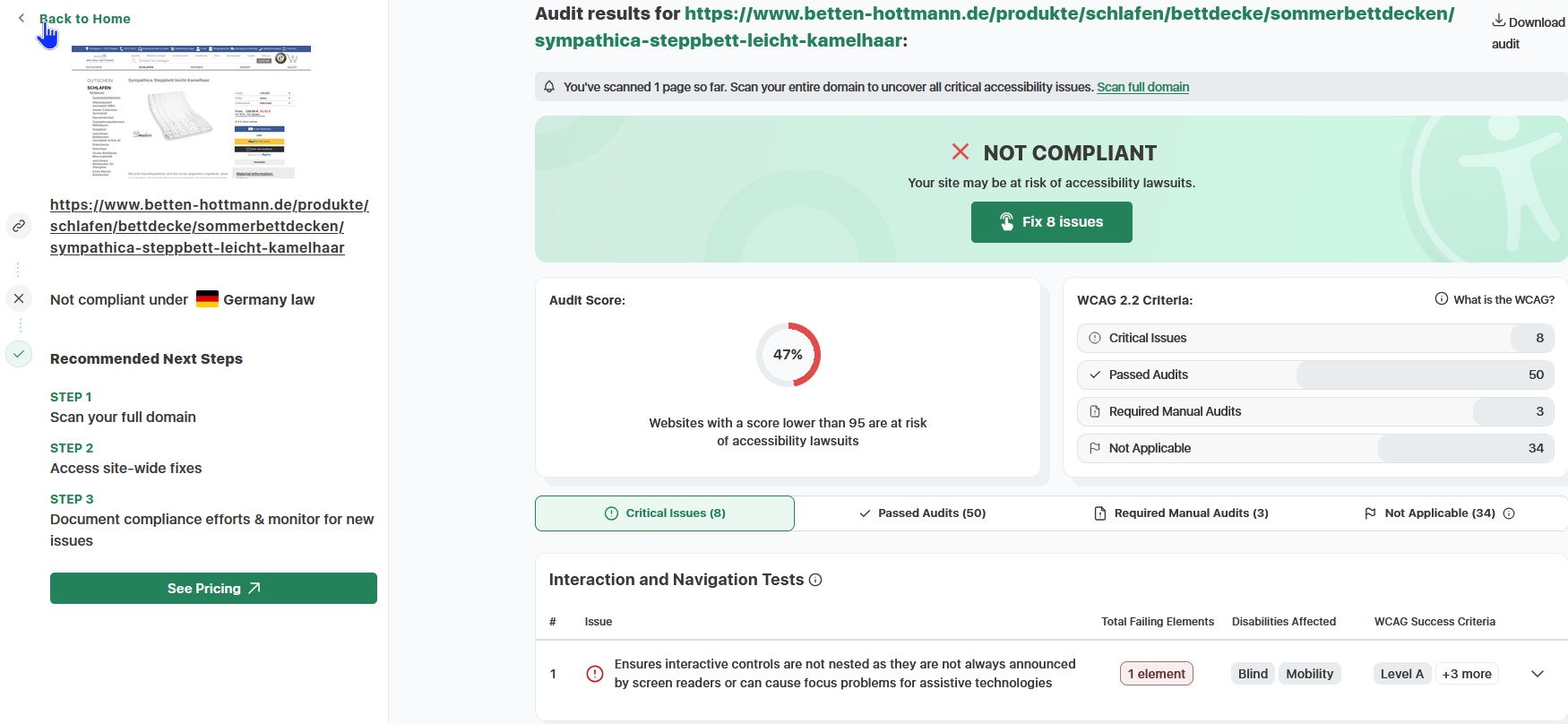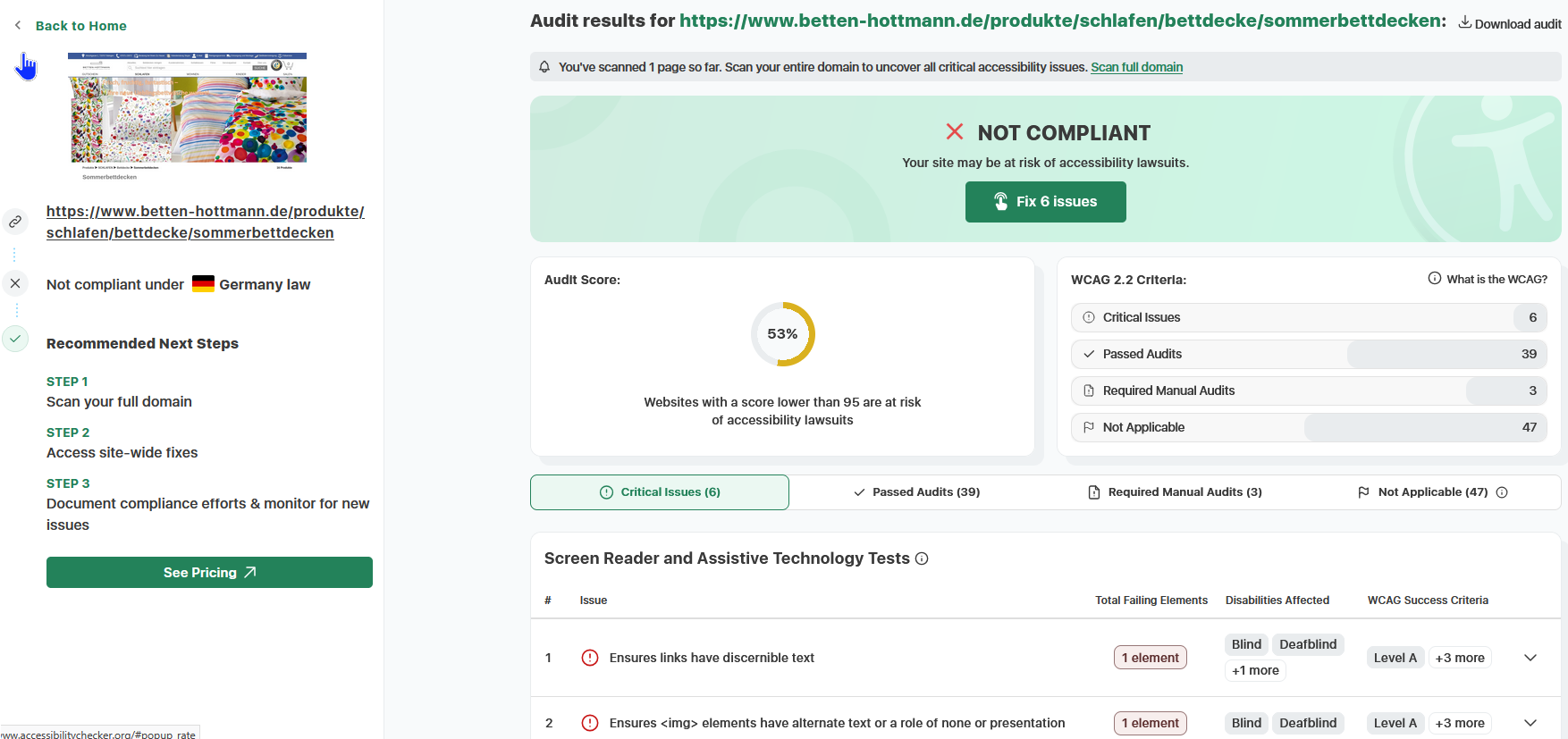 Zur Veranschaulichung unserer kontinuierlichen Überprüfungen der Barrierefreiheit haben wir Ergebnisse aus dem etablierten Tool accessibilitychecker.org dokumentiert. Diese Screenshots illustrieren exemplarisch identifizierte Barrieren sowie die erzielten Fortschritte. Im Folgenden finden Sie drei ausgewählte Screenshots solcher Prüfungen: